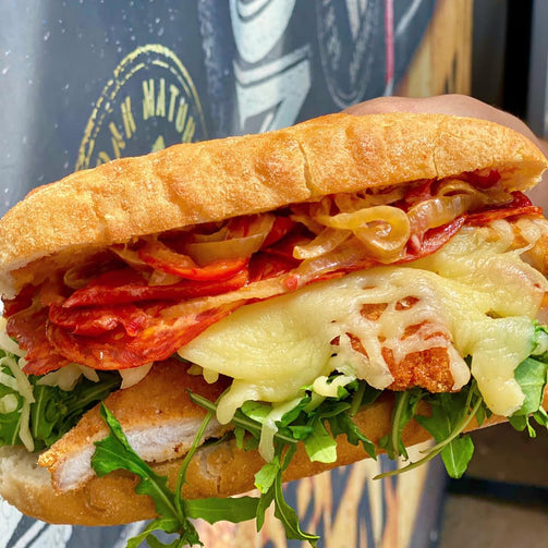 - House Made Pannini, House Made Snitty, Melted Mozzarella, Spicy Chorizo, Rocket, Peperonata, Chipotle Mayo